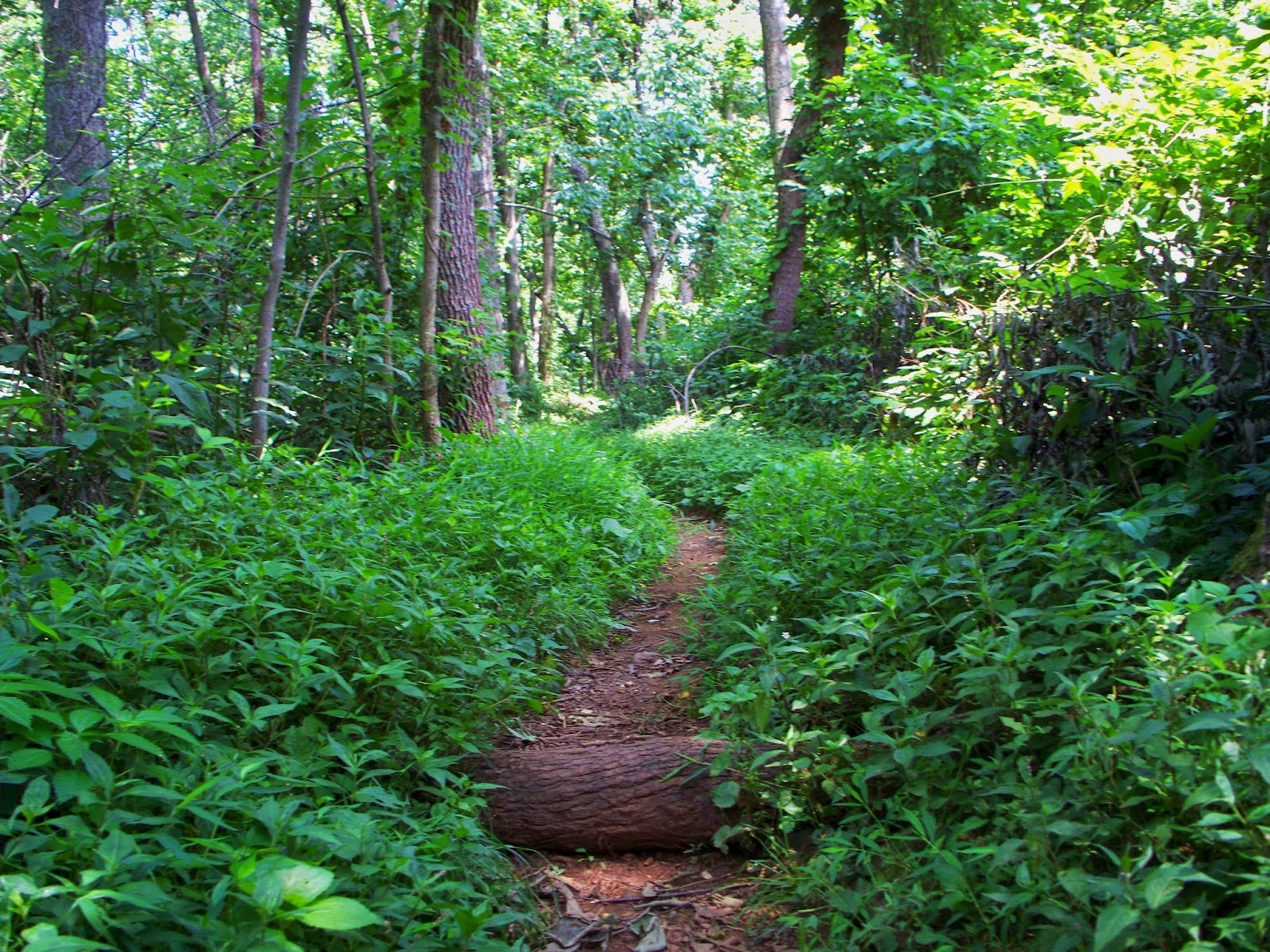 At about the 3.5-mile mark, I crossed over into the G.R. Thompson Wildlife Management Area.  Consisting of an area of 4,000 acres, the area is rich in deer, turkey, and grouse, and has lakes stocked with trout.  It is a popular place for hunters, hikers, birders, and...flowerers?  Anyway, I couldn't see much from the trail, except for the dense undergrowth, and the occasional forest, but it was a very lovely area, although probably much lovelier when the air's a bit cooler.  It was the increasing heat, aggravated by the loss of the breeze from earlier that convinced me to turn around at the four mile point.  In the undergrowth, the air was incredibly still and buggy.  the sight of the tail of a snake oozing into the ground cover brought me to a halt.  I waited until it was completely gone, and continued on.  I crossed back into Sky Meadows and arrived at the point where the AT meets the Park's North Ridge Trail.  At that junction, someone had decided to build a stout bench.  I took advantage, and sat down for lunch.