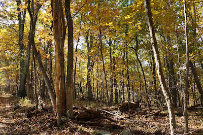 After entering the park at the north end south of Front Royal, we drove to the first visitors center at Dickey Ridge. After consulting the map, we decided to do two trails that are normally (sort of) connected. The first one was the Fox Hollow Trail. This is a short 1.4-miler that drops down the slope of the ridge to the site of the farm of one Thomas Fox. His family farmed this 450 acres for over 100 years before being displaced by the establishment of the Park in 1935. The family cemetery, one of 100 such in the park, is at the lower end of this loop trail. The trail itself starts across the road from the visitors center and starts downhill from its intersect with the Dickey Ridge Trail. The leaves are nice, predominantly yellow, though you can see that the winds have been at work here, as there are noticeably bare branches and the ground is covered with a fresh layer.
